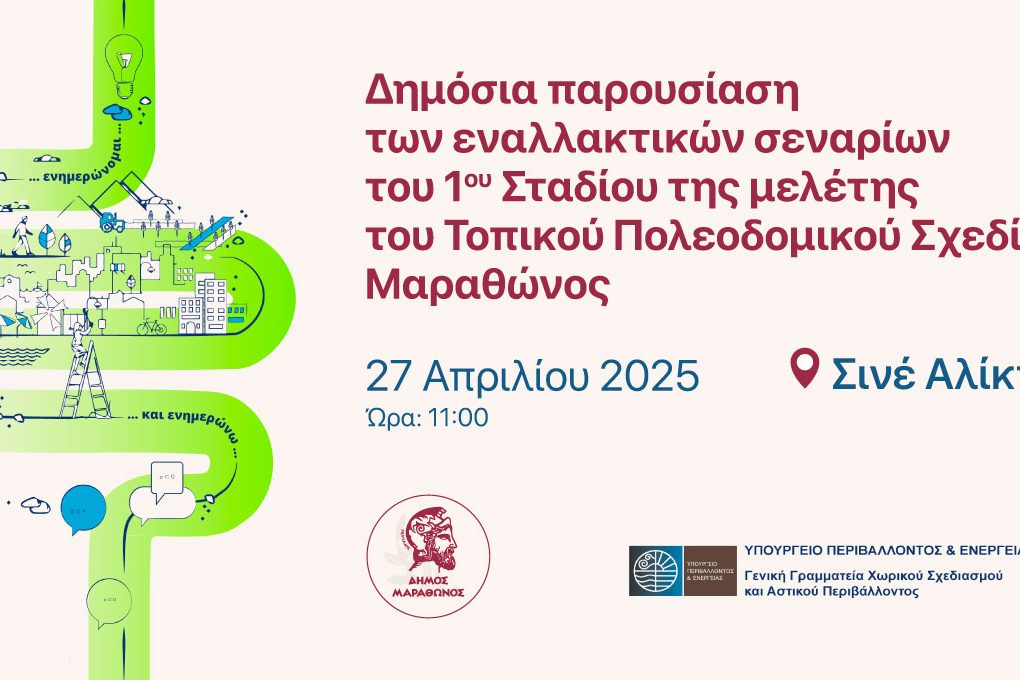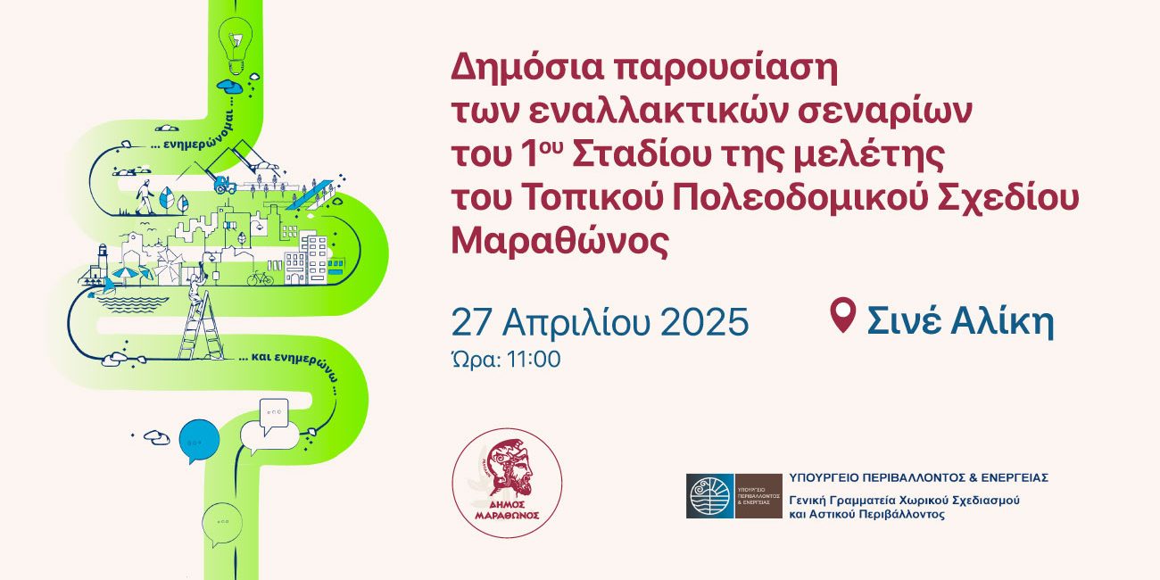 Την Κυριακή 27/4/2025 στις 11:00, ο Δήμος Μαραθώνα σας προσκαλεί να παρακολουθήσετε τη Δημόσια παρουσίαση των εναλλακτικών σεναρίων του 1ου σταδίου της μελέτης του Τοπικού Πολεοδομικού Σχεδίου (ΤΠΣ) του Δήμου μας.