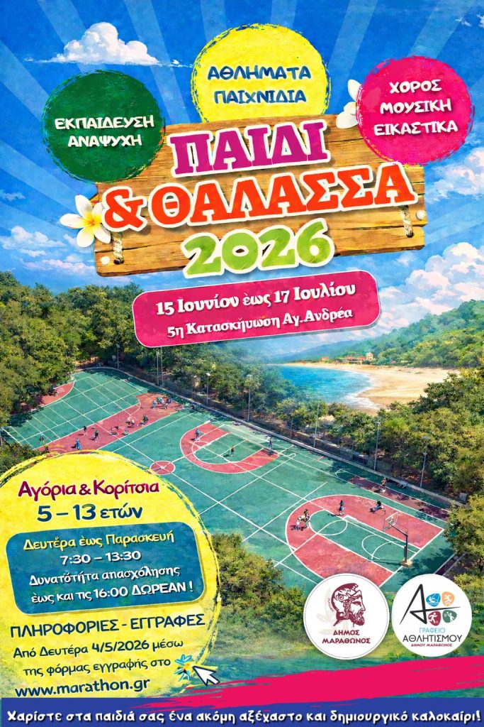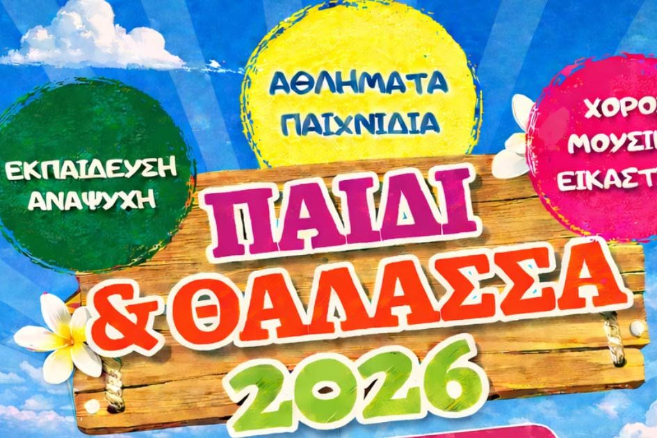 Το πρόγραμμα «Παιδί & Θάλασσα 2026» είναι ένα ημερήσιο camp για αγόρια & κορίτσια 5-13 ετών που περιλαμβάνει προγράμματα εκπαίδευσης και αναψυχής μέσα από ομαδικά παιχνίδια και δραστηριότητες στο ύπαιθρο και στη θάλασσα.