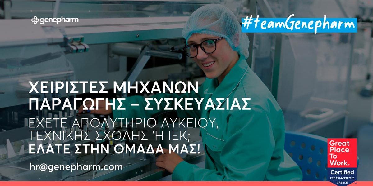 Ενημερώνουμε τους δημότες ότι η φαρμακοβιομηχανία Genepharm, με έδρα την Παλλήνη προχωρεί σε προσλήψεις προσωπικού.